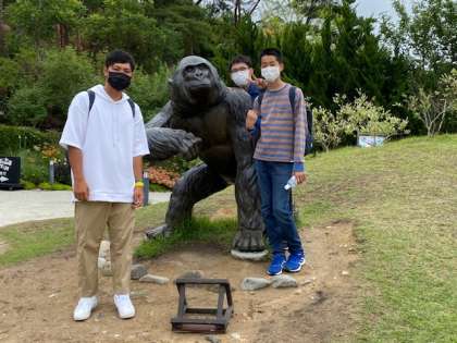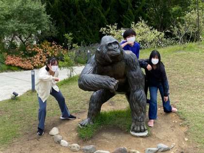 ゴリラの像と一緒にポーズ。