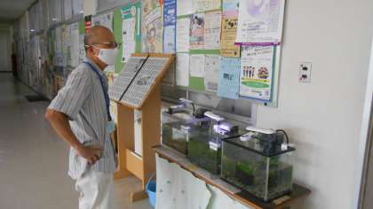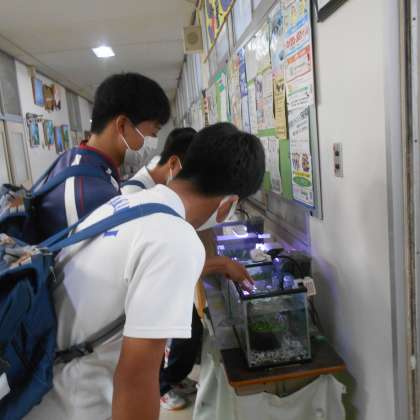 職員室の前の水槽では、小さな魚やエビたちが元気よく泳いでいます。水槽もきれいにしていただきました。生徒たちも毎日気にしながらのぞいています。