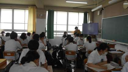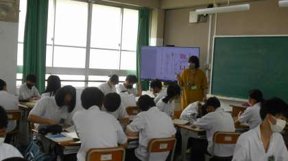 2年生の国語の授業の様子です。国語の授業では「自分で考える時間」をもとうを題材にして、映像も見ながら、情報の受け取り方について考えました。班でも意見を交換していきました。