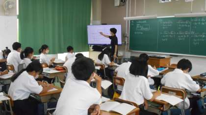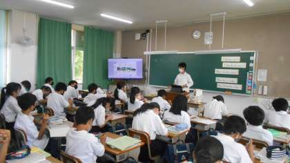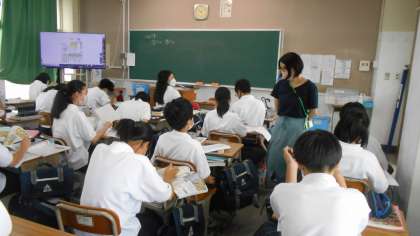 1年生の授業の様子です。数学の授業では、文字式の利用で自分で考えたことを文字式で表していきました。英語の授業では、「夏休みの過ごし方」の英語の会話について考えました。社会の授業では、「大宝律令」について自分たちで調べていきました。