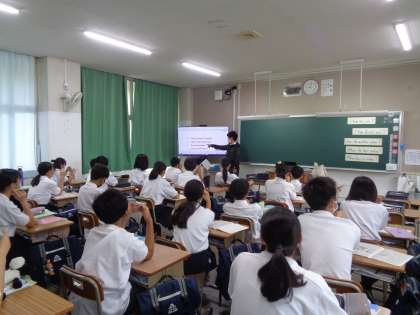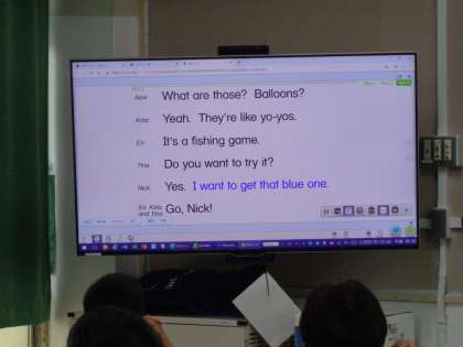 動画の会話を見て聞いて,大型テレビに映しながらみんなで会話を練習していました。
