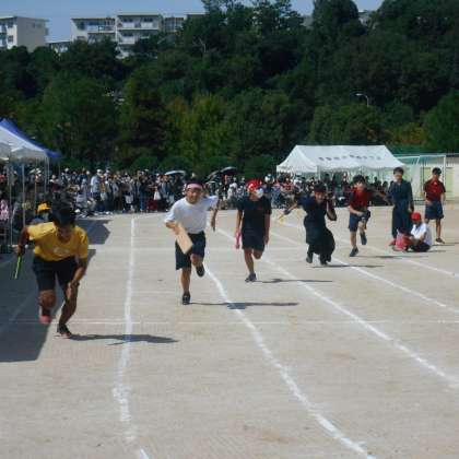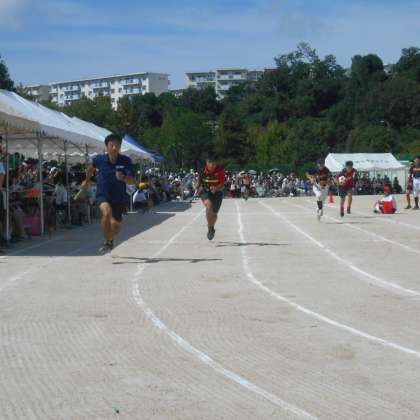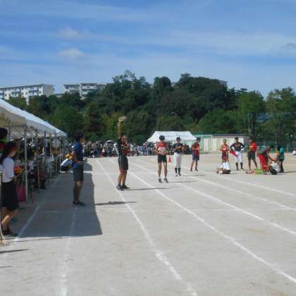 男子の部活動対抗リレーです。1レースめは卓球部・剣道部・水泳部・囲碁将棋部です。2レースめはサッカー部・野球部・陸上競技部・ソフトテニス部です。各部活動の紹介のあとには大きな拍手がありました。3年生のなかまや後輩たちの応援もたくさんありました。