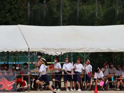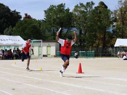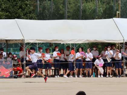 リレーです。応援も高まる種目です。クラスの走者を応援するシーンがたくさんあり,級友の応援により加速する場面も何度もありました。