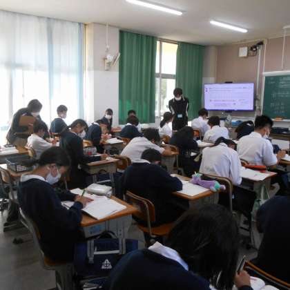 英語と数学の公開授業の様子です。英語は、「学校内の場所の表現方法について」練習しながら慣れていきました。数学は、反比例のグラフを作りました。また、グラフの特徴も考えました。