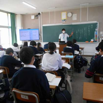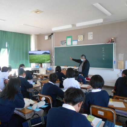 2組は「日本のお米」を題材に、映像も見ながら、米や稲が日本の食文化や自然環境を支や、伝統的な農業や文化を引き継いでいくことの大切さについて考えました。