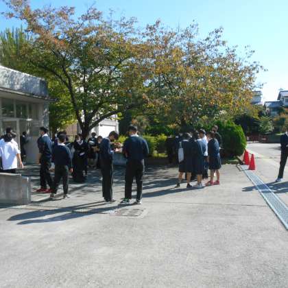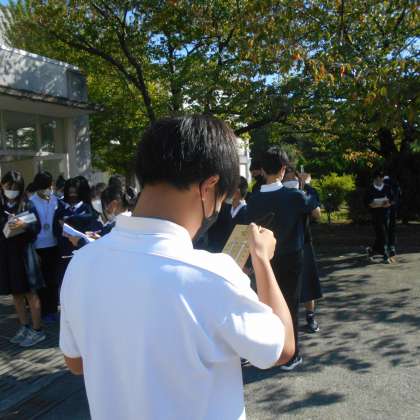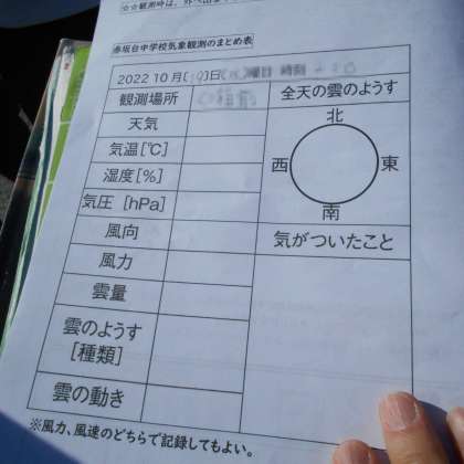 くつ箱付近の気象観測を行いました。温度計・乾湿温度計、風向計、風力計などを用いて天気・気温・湿度・風向・風力など気象に関する情報を集めていきました。