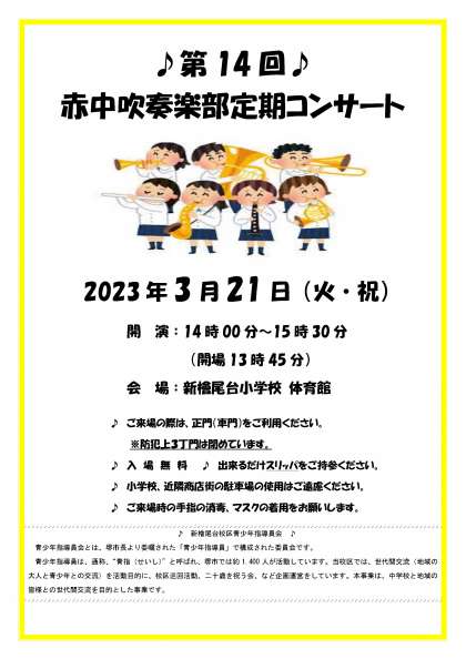 本校吹奏楽部が3月21日(祝)14時より、新檜尾台小学校で定期演奏会を開催します。