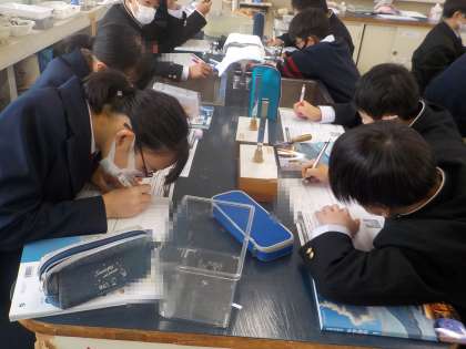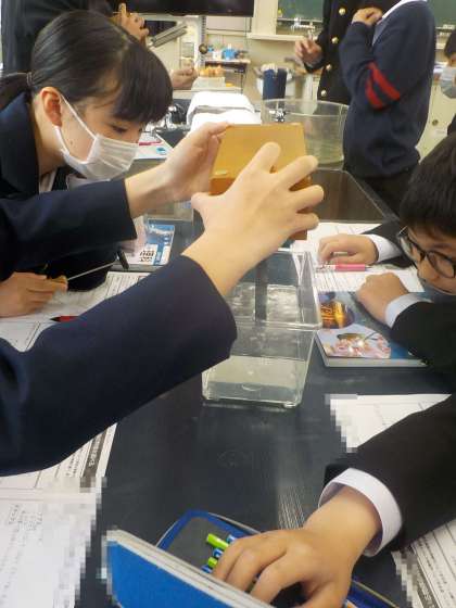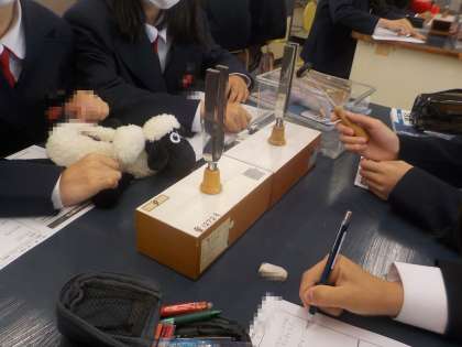 1年生の理科の授業では「おんさ」を使って音の伝わり方を考えました。水中での振動の様子も確認しました!