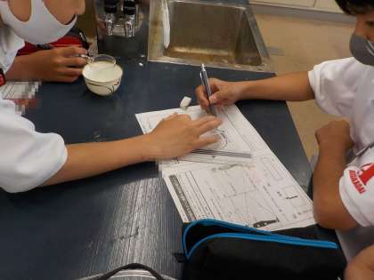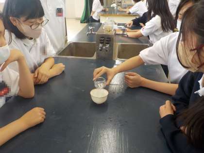 1年生の理科の授業では、コップに水をいれて、中のコインが浮かびあがって見える様子を確認し、光の屈折について考えました。