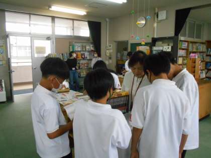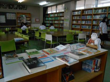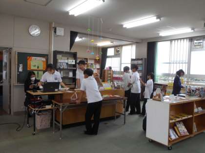 昼休みには多くの生徒たちが図書室の本に親しんでいます。