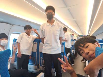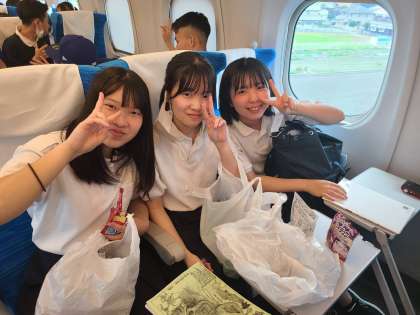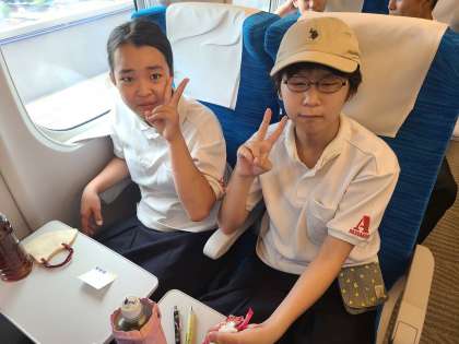 新幹線内でお菓子を食べたり、お話をしたり、写真を撮ったりして楽しんでいます。