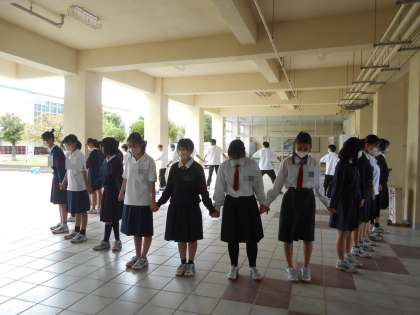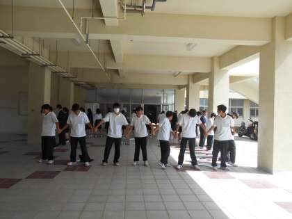 2年生の理科の授業では、ヒトが刺激を受け取ってから反応するまでの時間を調べました。実際に輪を作って、反応を伝えていきました。
