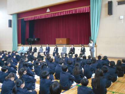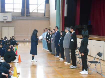 着任した先生からあいさつがあり、そのあと生徒会の代表の生徒から歓迎の言葉がありました。