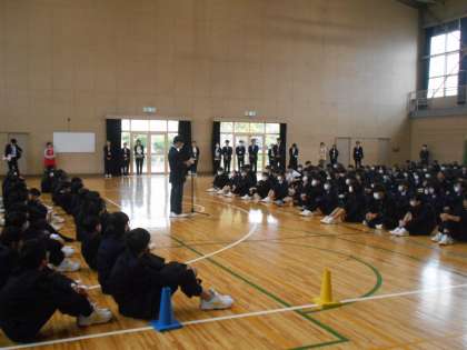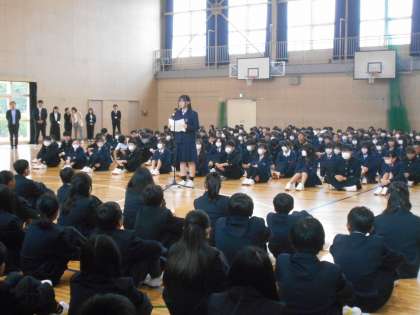 1年生と2・3年生が向かい合い、まず最初に2・3年生を代表して生徒会から歓迎の言葉がありました。
