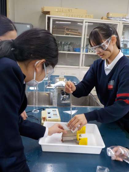 2年生の理科の授業では、水に電流を流し、分解されて発生する気体が何かを調べました。