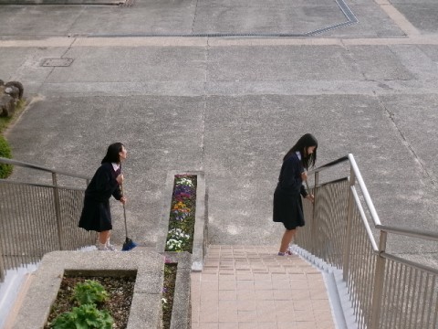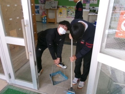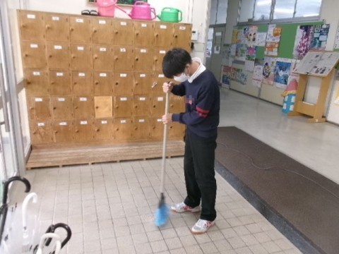 写真は、職員玄関を清掃してくれている生徒の様子です。