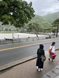 雨の嵐山です。予定より30分遅れの14:30に嵐山を出発します。帰校は16時頃を予定しています。