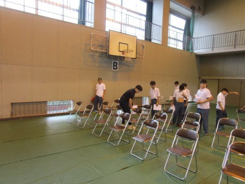 メジャーで直線を引き、椅子をそれに沿って、綺麗に並べていました。