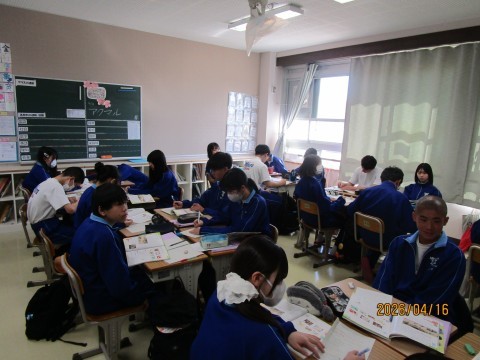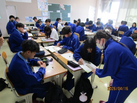 16日 3年生の様子 公開日 2026/04/16 更新日 2026/04/16 3年生 3年生の英語の授業の様子です。グループで活動していました。課題を協働的に学習していました。疑問をみんなで考えあうのはよいですね。
