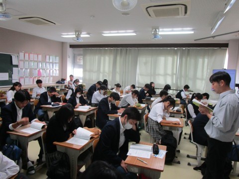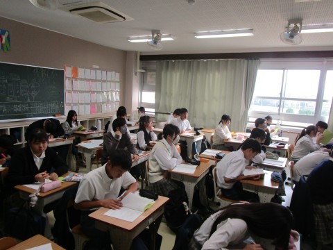 真剣なまなざしで説明を聞きながら,進路資料の冊子を見ていました。