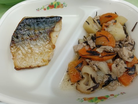 さばの塩焼き、じゃがいものいそ煮、五目汁、ごはん、牛乳