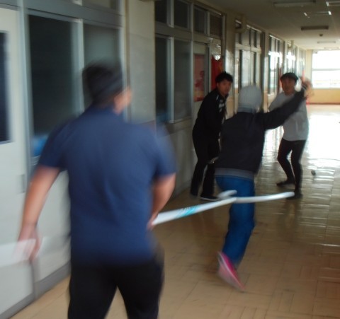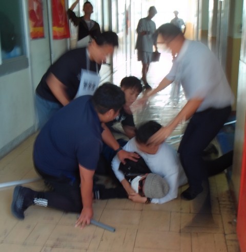 学校に不審者が侵入してきた想定で訓練を行いました。生徒は教室の扉を机でバリケードを作り侵入を防ぎ、先生はさすまたで侵入者を取り押さえて、駆けつける警察官に引き渡しました。