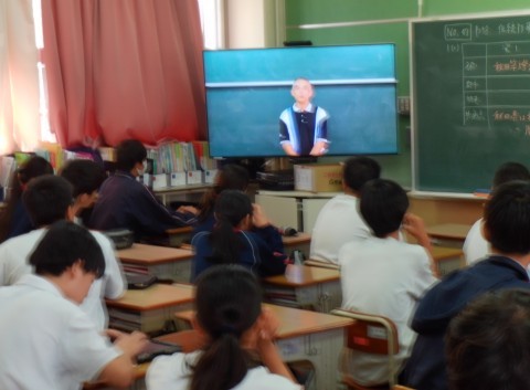 教育委員会から安全指導員の講評で、中学生の身の回りには危険がいっぱいあるので身を守ることや誘惑に乗らないことを伝えてもらいました。