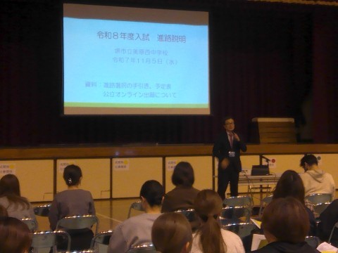 昨年度から始まった公立高校入試のオンライン出願をはじめ,これからの進路決定に向けた流れを進路指導主事から説明しました。