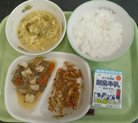 すき焼き、揚げきんぴら、かきたま汁、ごはん、牛乳です。