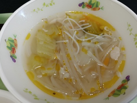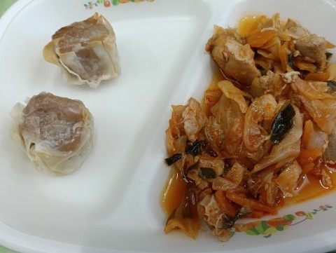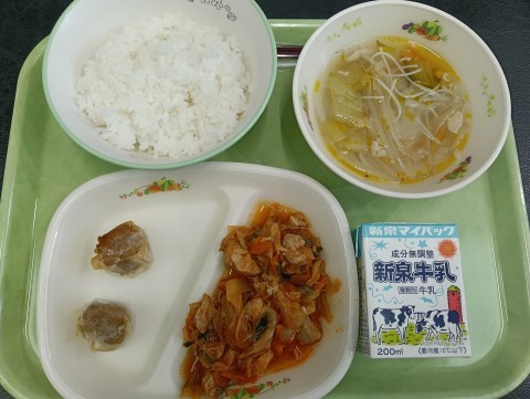 ごはん、牛乳、タッカルビ、焼きシューマイ、ビーフンスープ
