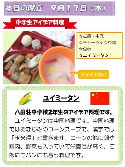 ●本日の給食 〜9月17日(木)〜【生活リズム】