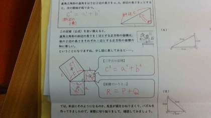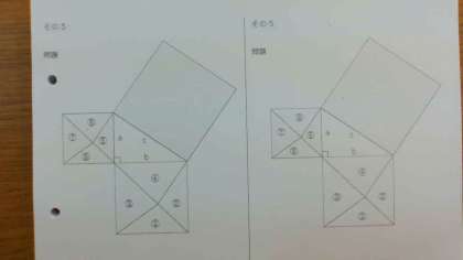 授業に導入では、直角三角形の斜辺を1辺とする正方形の面積は、他の2辺をそれぞれ1辺とする正方形の面積の和に等しいということを導きました。