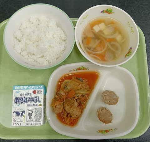 タッカルビ、焼きシューマイ、中華スープ、ごはん、牛乳