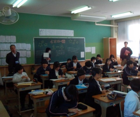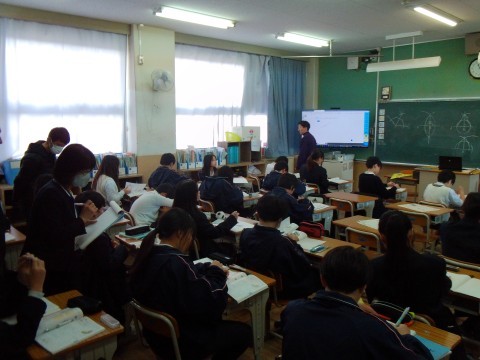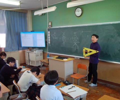 1年生の数学の授業では、平面図形について学んでいます。教育委員会から指導に来てもらって授業力を高めていきます。