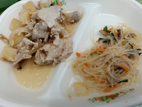 豚肉のみそマヨガーリック焼き、春雨の炒め煮、塩ちゃんこ汁、ごはん、牛乳