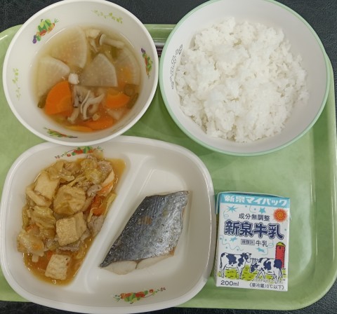 さわらの風味焼き、厚揚げとキャベツのみそ炒め、ごはん、牛乳