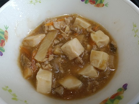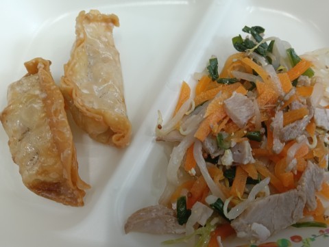 本日の給食の献立はごはん、牛乳、麻婆豆腐、揚げギョーザ、もやしのからしあえからしあえのマスタードは「粒マスタード」といって、からみの少ないもので、食べやすくなっています。