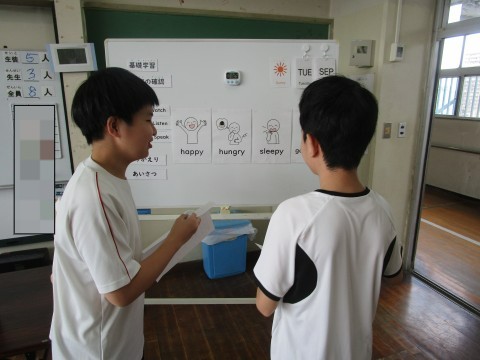 基礎学習(英語)の様子です。友だち同士で「How are you ?」「I'm happy !」ジェスチャーや表情などを交えて,今の自分の気持ちを伝えあっています。