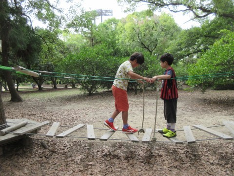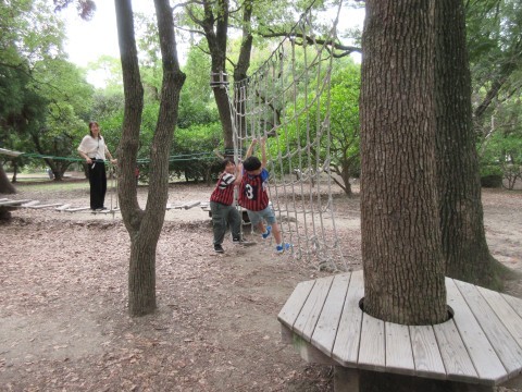 南こども広場では、アスレチックと滑り台の遊具やブランコや砂場があり、ボウケンノモリでは、丸太渡りやネットのアドベンチャー遊具がありました。体を上手に使いながら、友だち同士で和気あいあいと楽しみました。