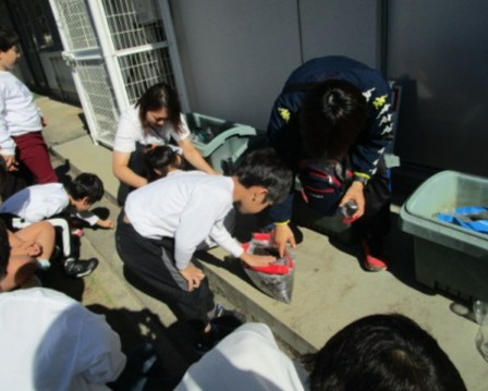 2年生の栽培の学習です。カブの種を植えました。先生の説明を聞いた後,順番に種を植えます。1人ずつ,植えるところがあります。そこに,丸いしるしを置いてもらって,種を植えます。とても小さな種でしたが,指先でつまんで,土の中に入れ,土をかぶせました。大きなかぶに成長して欲しいです。