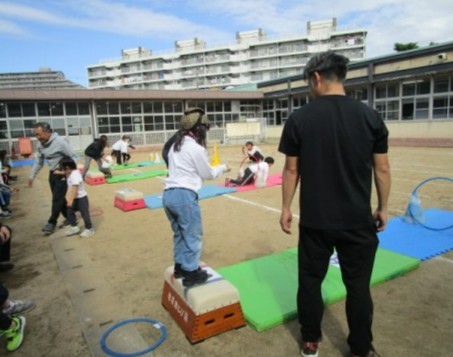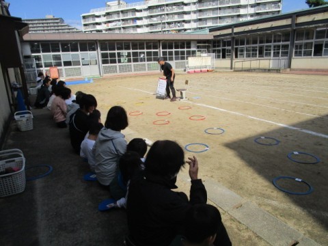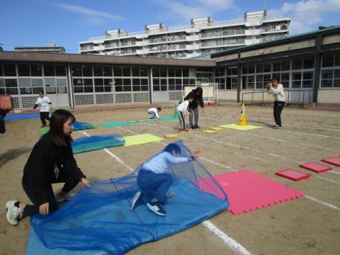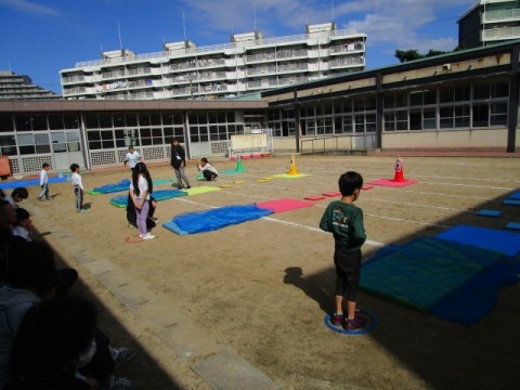1年生の体育です。中庭で,色々な競技をしました。初めは,体操。先生の見本を見た後は,順番に走ったり,網をもぐったり,順番に行いました。