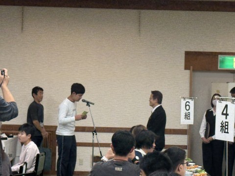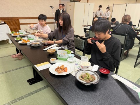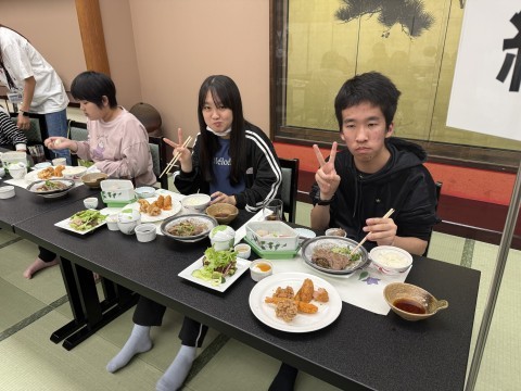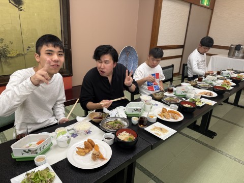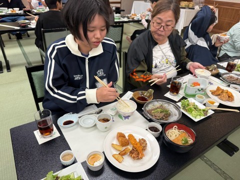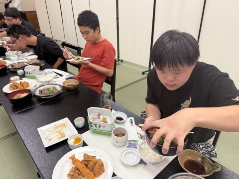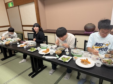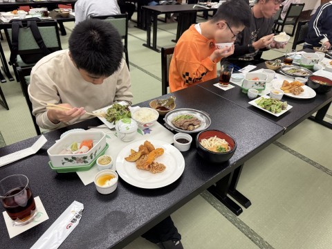 入館式が終わり、夕食の時間です。お刺身あり、唐揚げあり、うどんまでお腹いっぱいになりました。