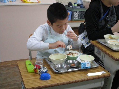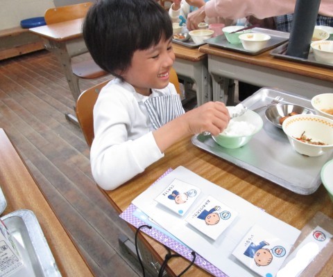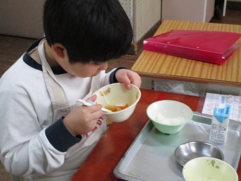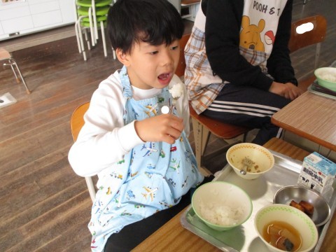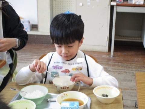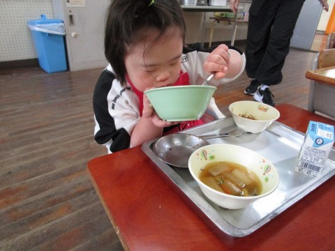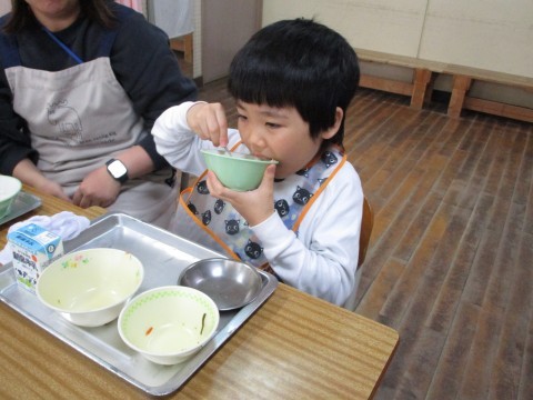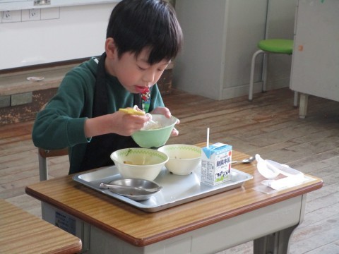 また、「お椀を持って食べると食べやすよ。」という先生の話を聞いてそーっとお椀を持ち、