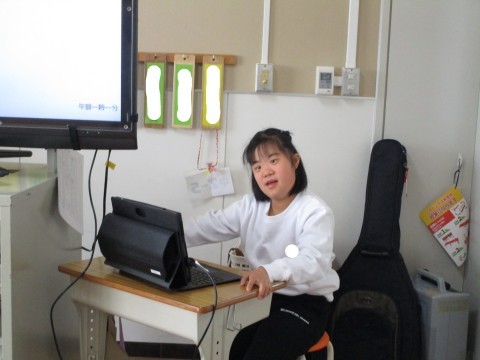 授業の始まりにお邪魔するとちょこんと小さい先生がパソコンの前に座っていました。