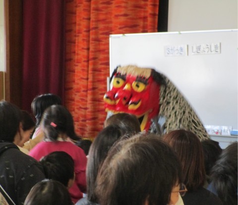 獅子舞がやってきました。ちょっぴり怖かったですが、近づいて頭をガブリとかまれていました。