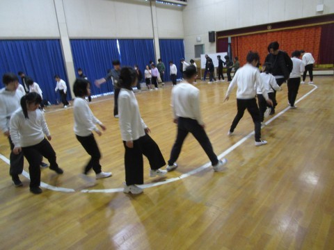 インストラクターの先生を招いてエアロビクスに取り組んでいます。白線に沿ってサイドステップに取り組みました。音楽に合わせて、一転方向に進みながらサイドステップ!どの生徒も慣れた様子でダンスに取り組んでいました。