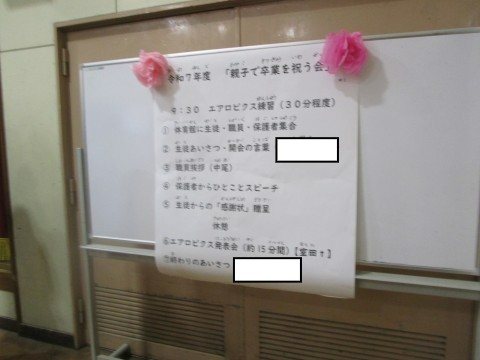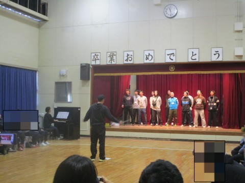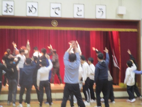 体育館で卒業を祝う会が開催されました。生徒や保護者の方から心のこもったスピーチやダイナミックなエアロビクスの発表がありました。