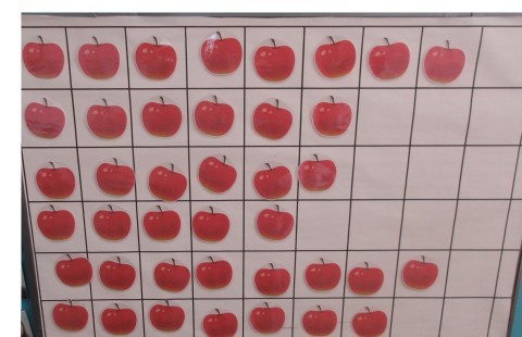 さいころに、1~3までの数字が書いてあり、出た目の数だけリンゴを取って、ホワイトボードに貼るという活動です。数字を見て、いくつ取るのかを考えて、数量に結びつけていきます。
