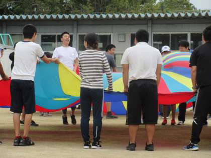 中学部は先日の体育発表会で行うことができなかったプログラム6 バルーン「わっしょい」を朝の時間にしました。