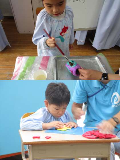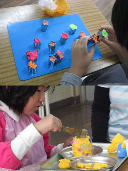 紙粘土を型押ししたり,できあがった「ペンたて」にニスを塗りました。